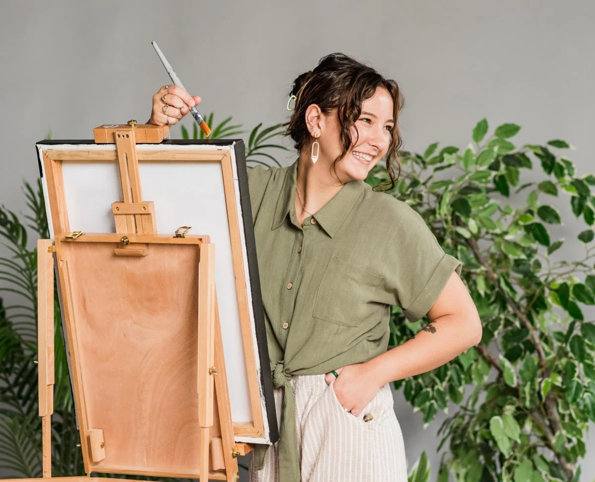 “Cayla, Milwaukee live wedding painter, holding her easel with a finished painting.”