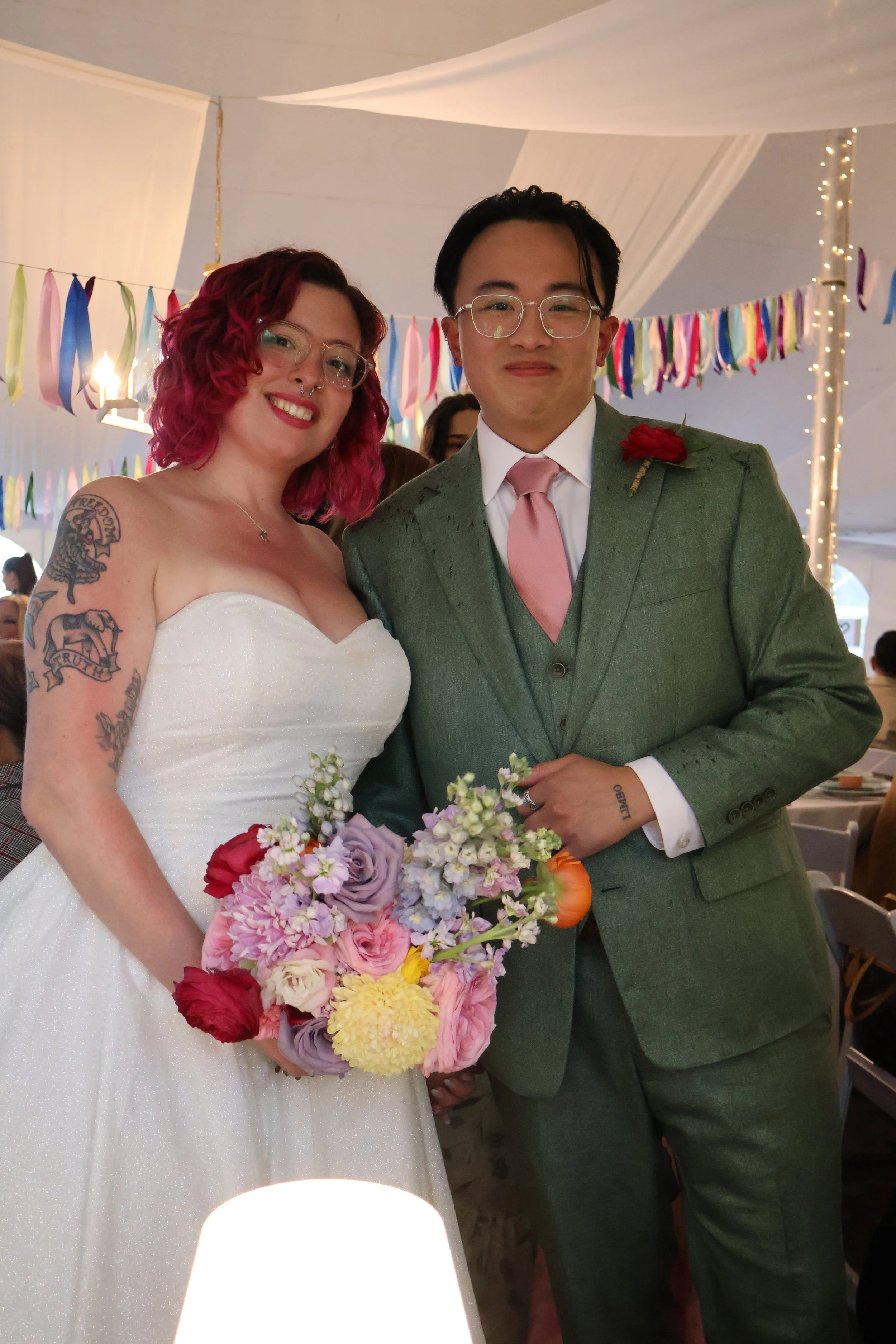 Bride in a white gown and groom in a green suit smile together, holding a colorful bouquet under ribbon and light decorations.