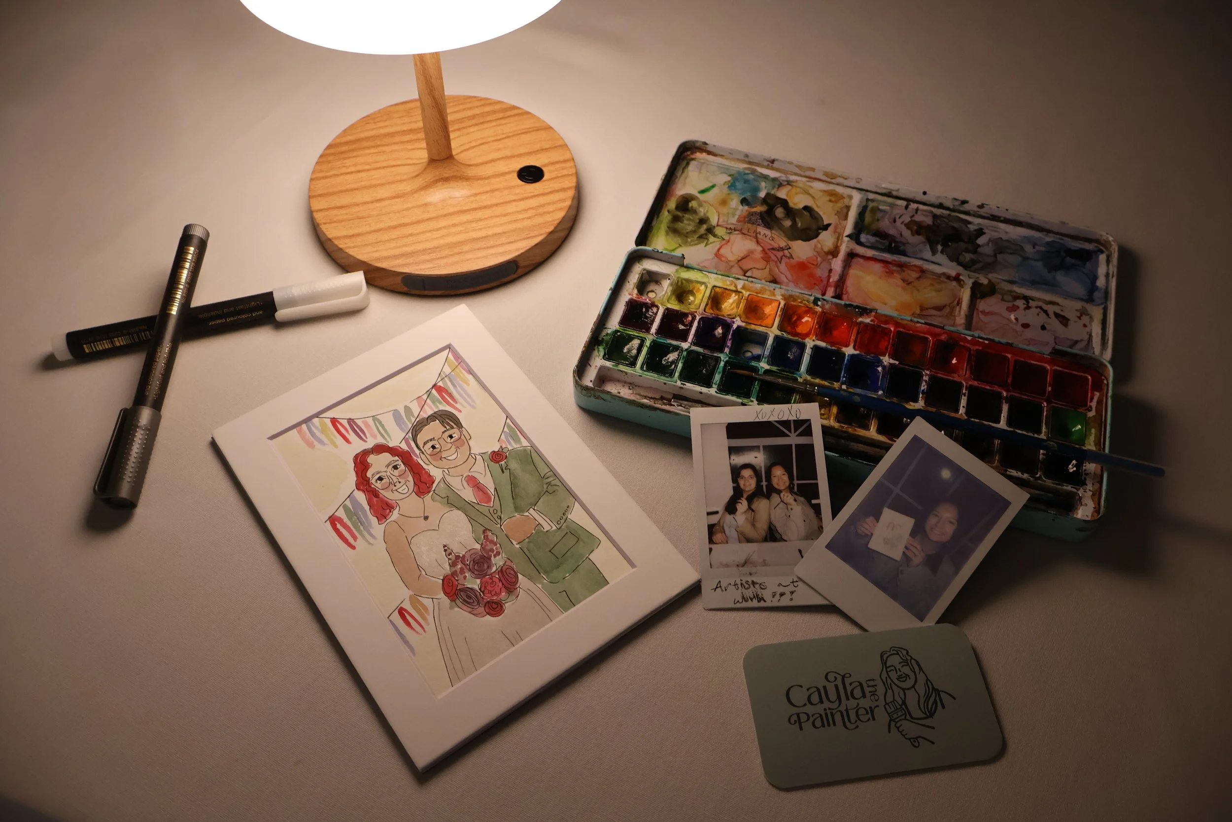 A cozy table setup with a finished wedding portrait, an artist’s watercolor palette, pens, and polaroids illuminated by a warm desk lamp.