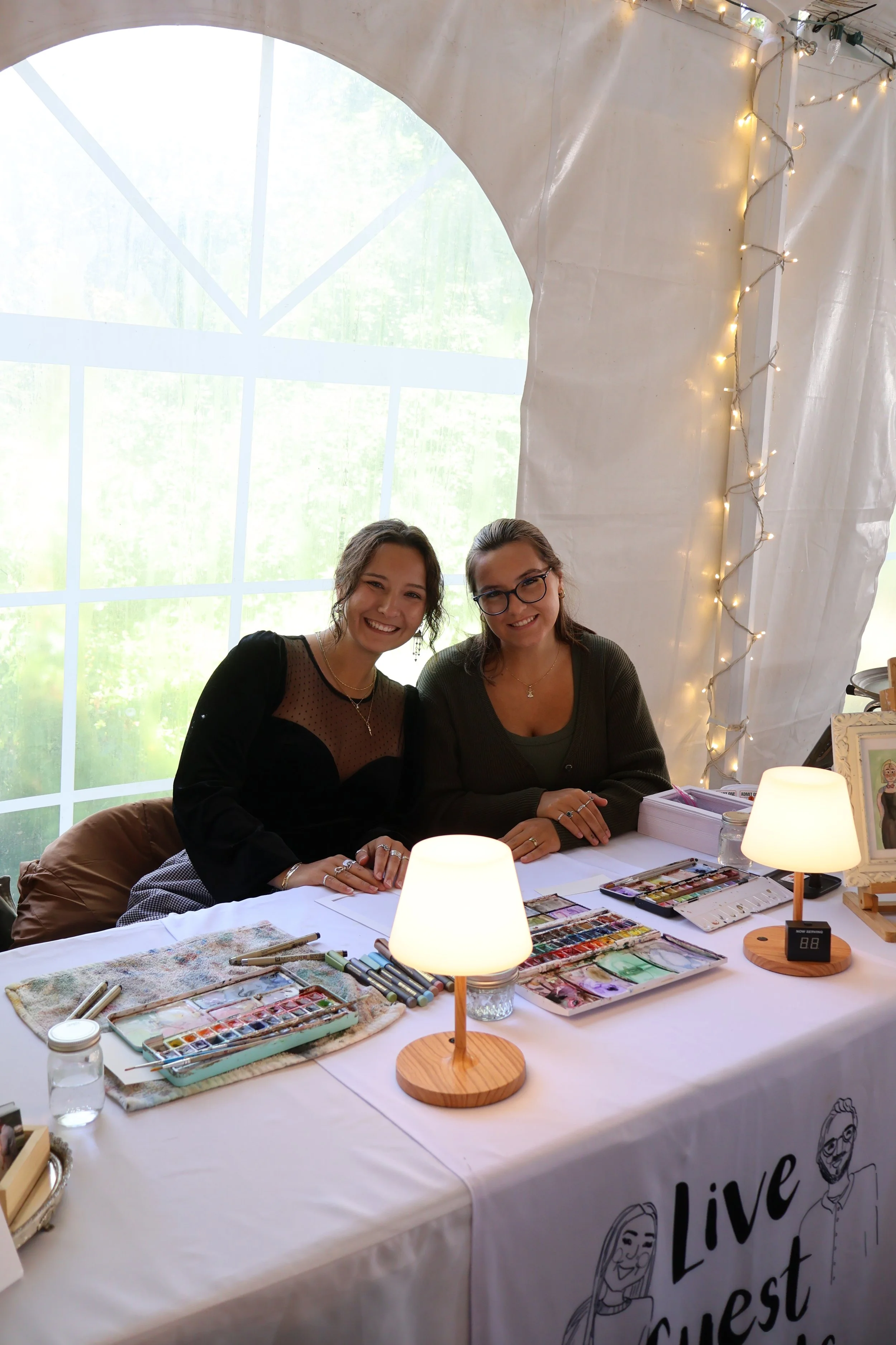 Two women smiling at a live wedding painting booth, seated behind a table covered with colorful paint palettes, portraits, and a custom tablecloth.