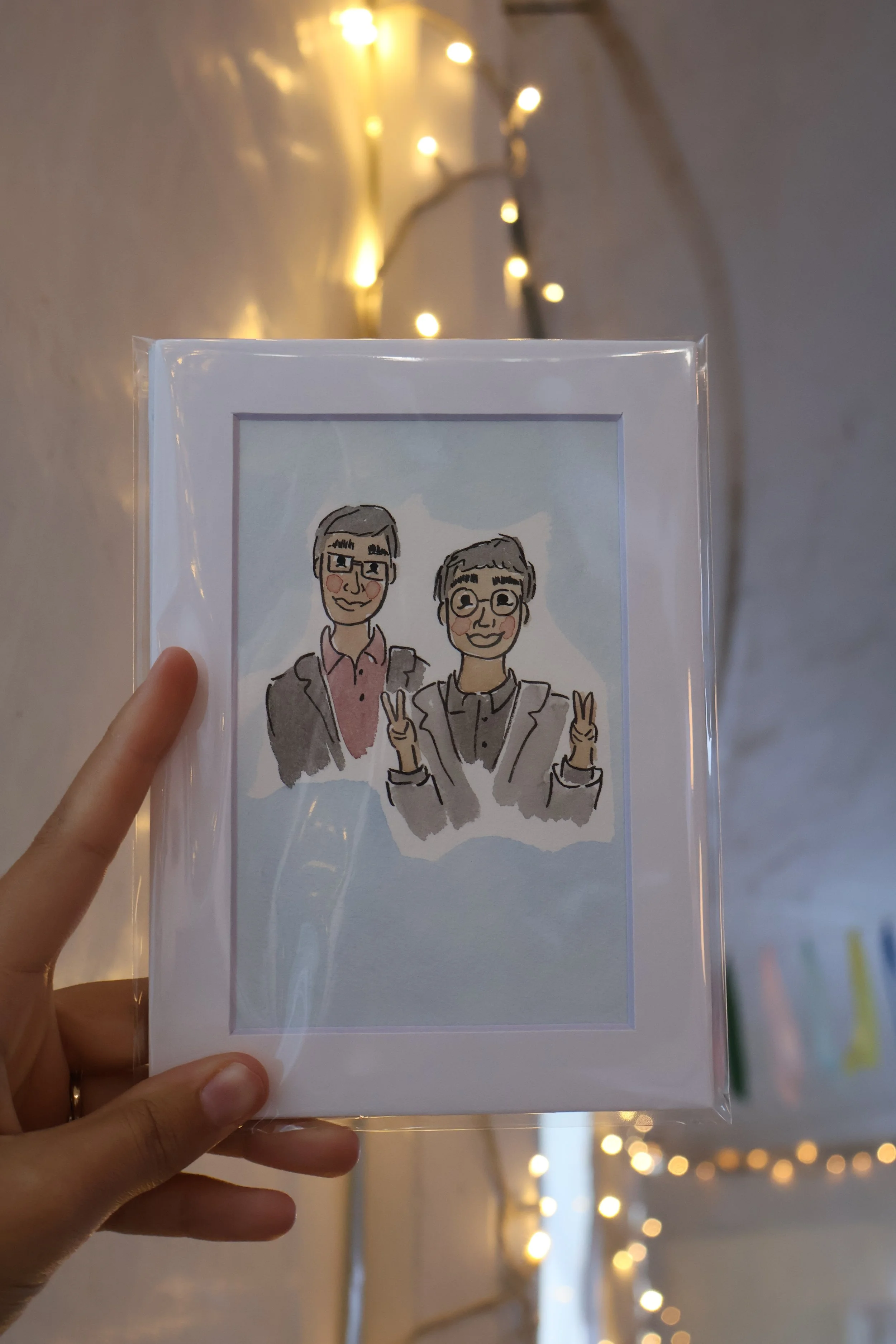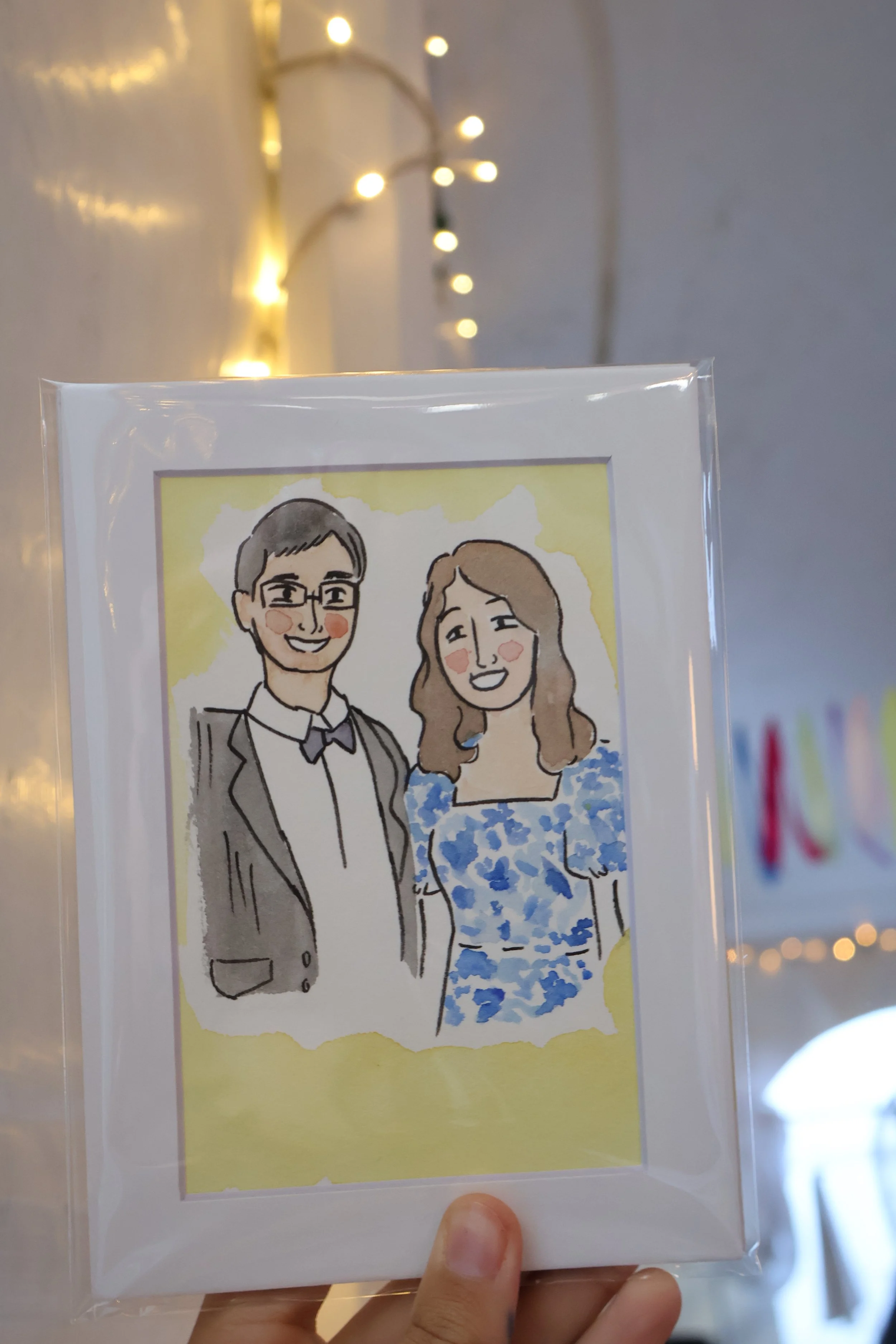 A hand holds a framed watercolor-style wedding guest portrait of a smiling couple, with string lights softly glowing in the background.