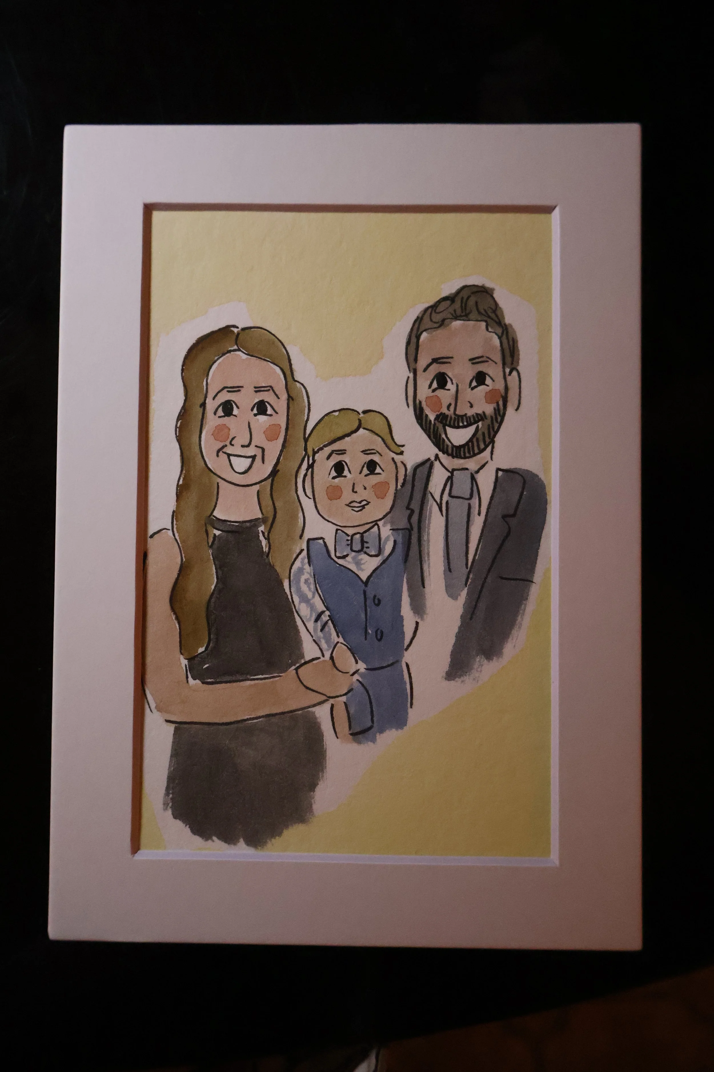 A framed watercolor portrait of a smiling family of three, featuring the parents and their young son dressed in formal attire. Soft lighting highlights the illustration.