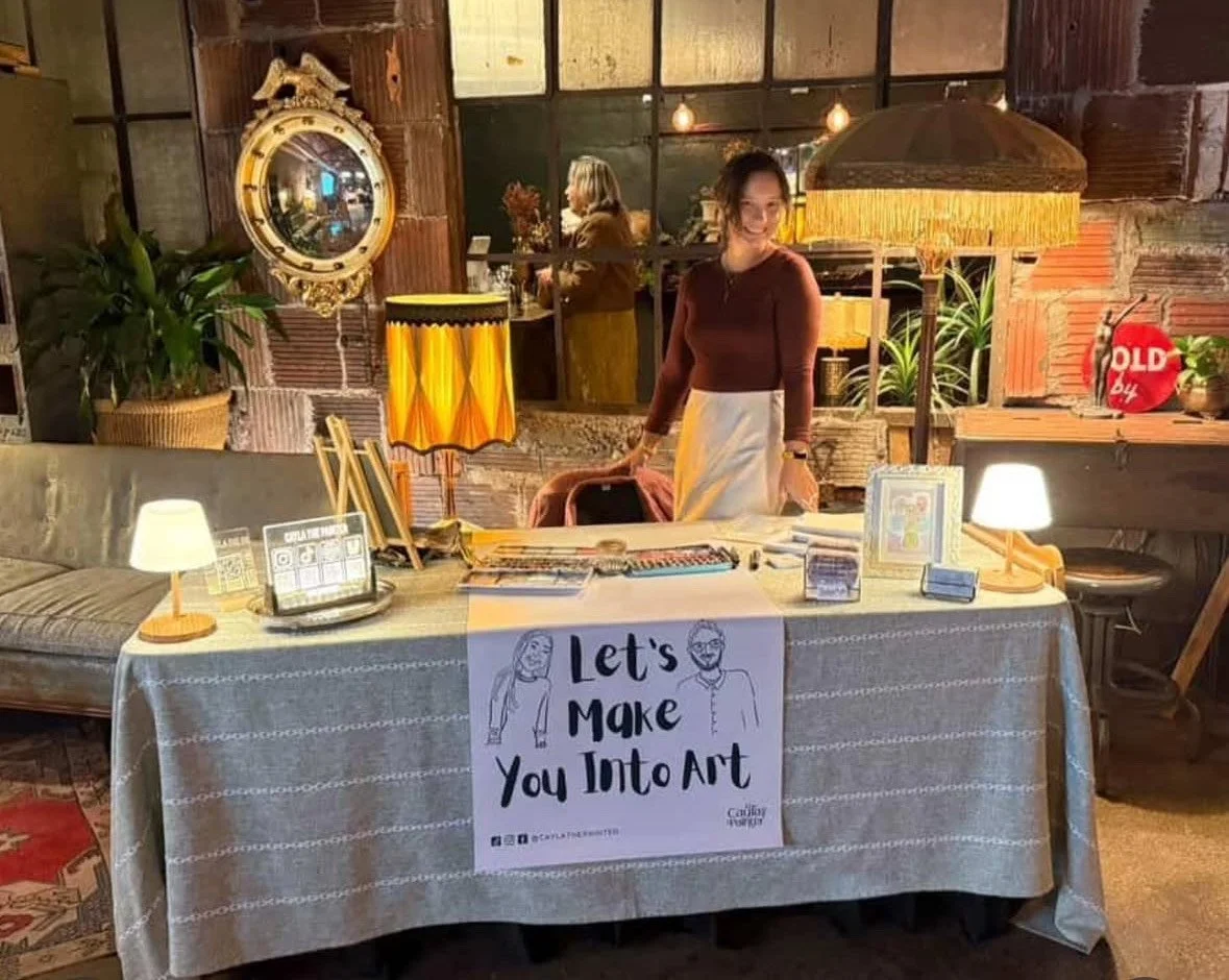Cayla standing behind her event booth, surrounded by her art setup and a sign that says “Let’s Make You Into Art.
