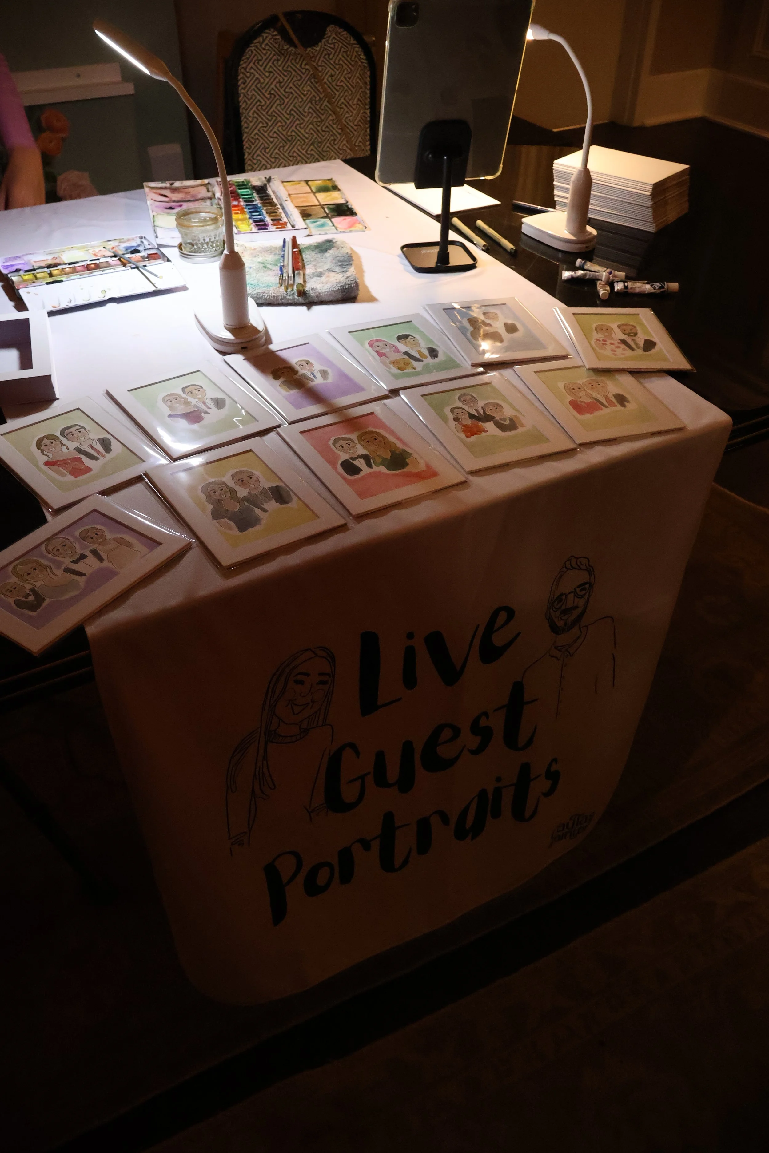 Her live guest portrait table at a wedding, featuring finished watercolor portraits, paints, and her lighting setup.