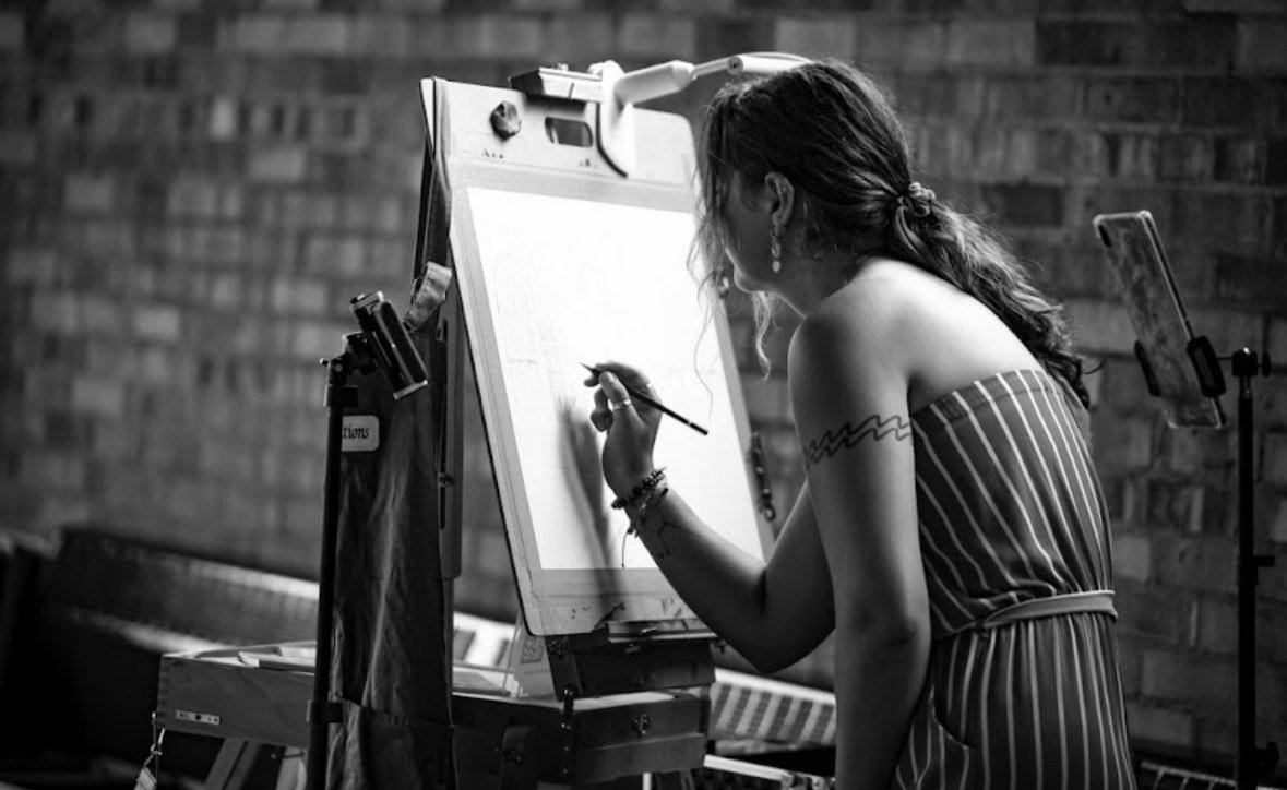 A black and white photo of Cayla painting live at her easel during an event, captured in the middle of her artistic process.