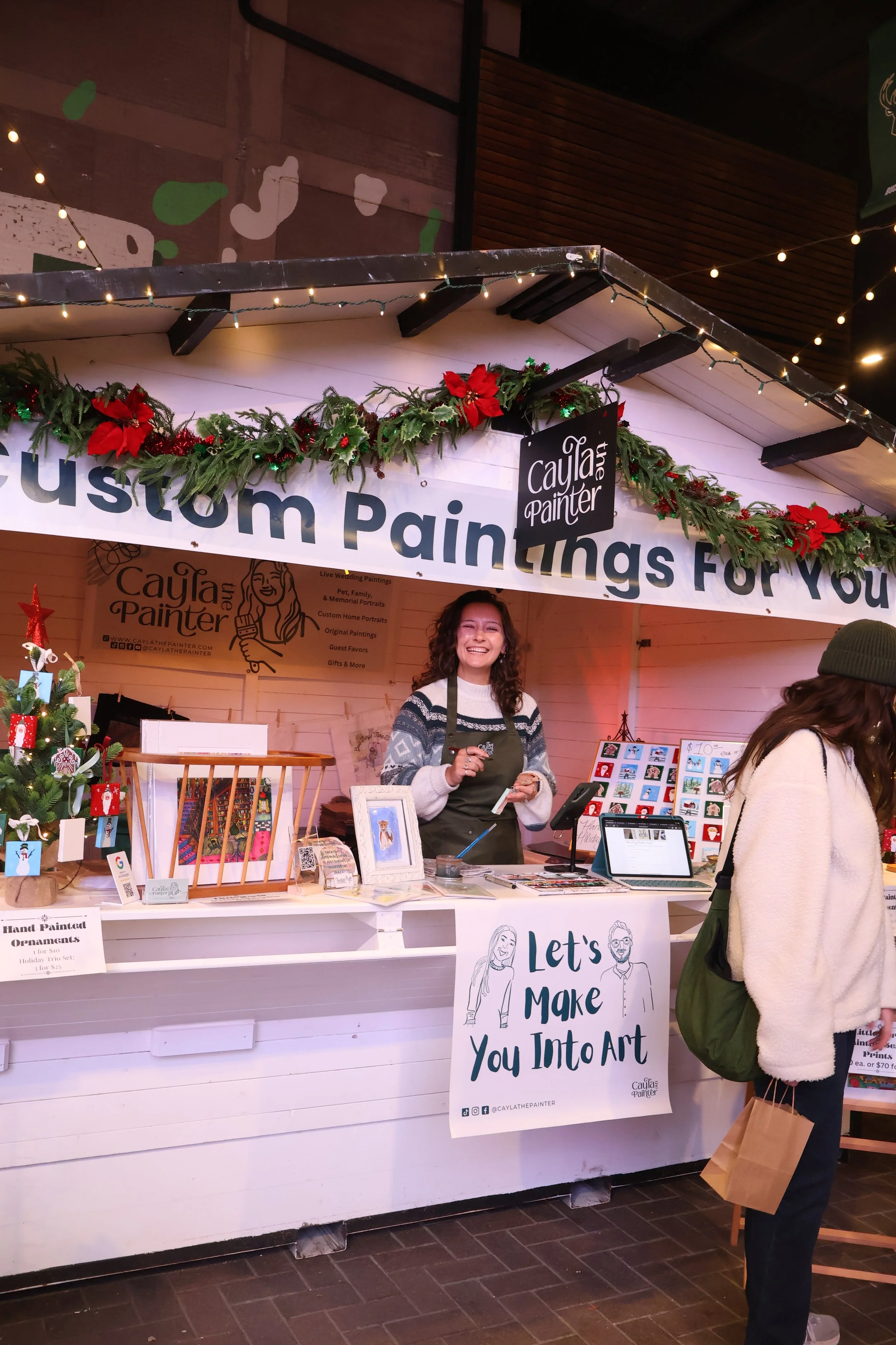 Cayla at her festive holiday market booth, surrounded by custom art and ornaments.