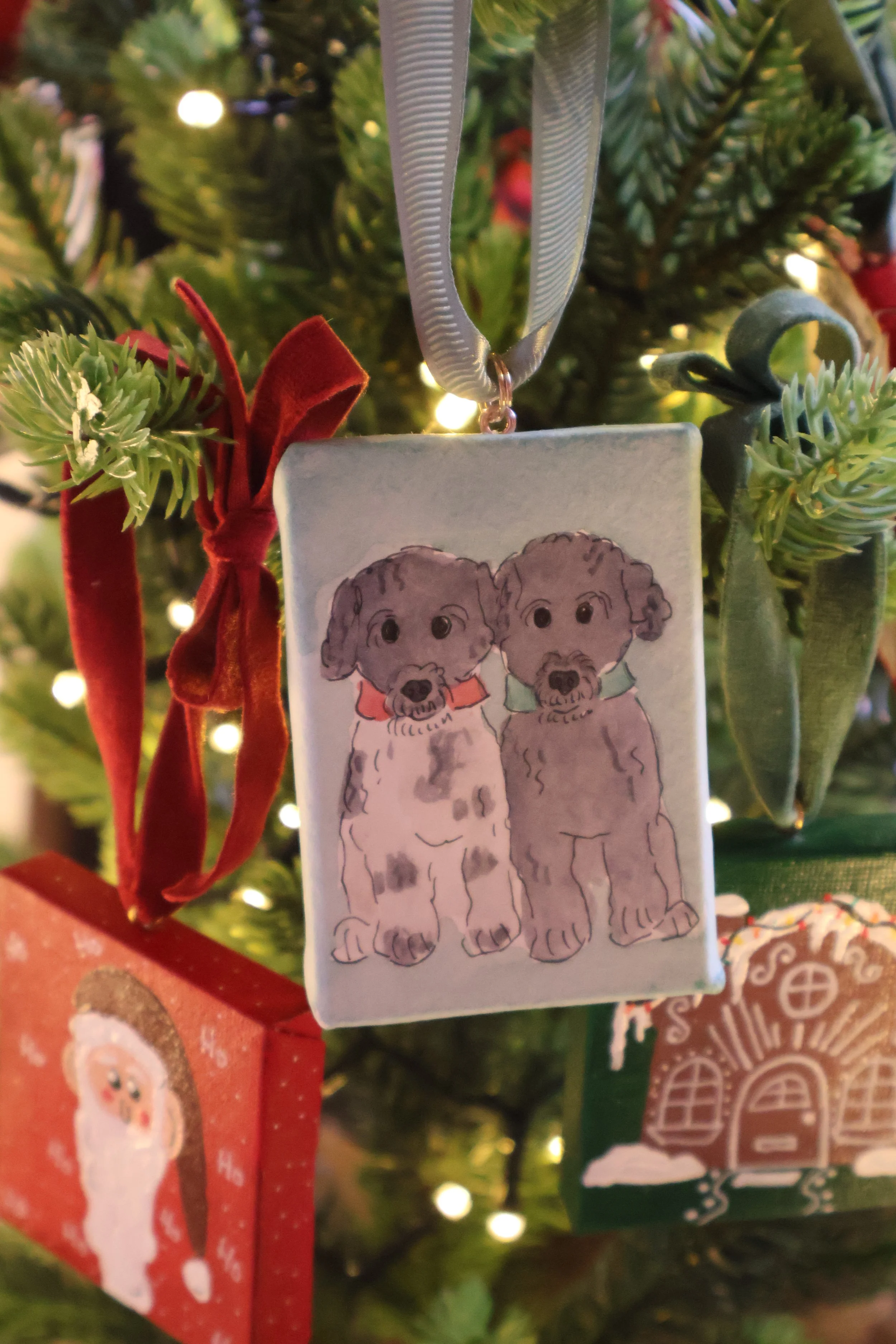 These are my most popular holiday items, tiny 2x3 inch canvases painted with pets, people, or special moments. They’re the perfect way to add personality to a Christmas tree.