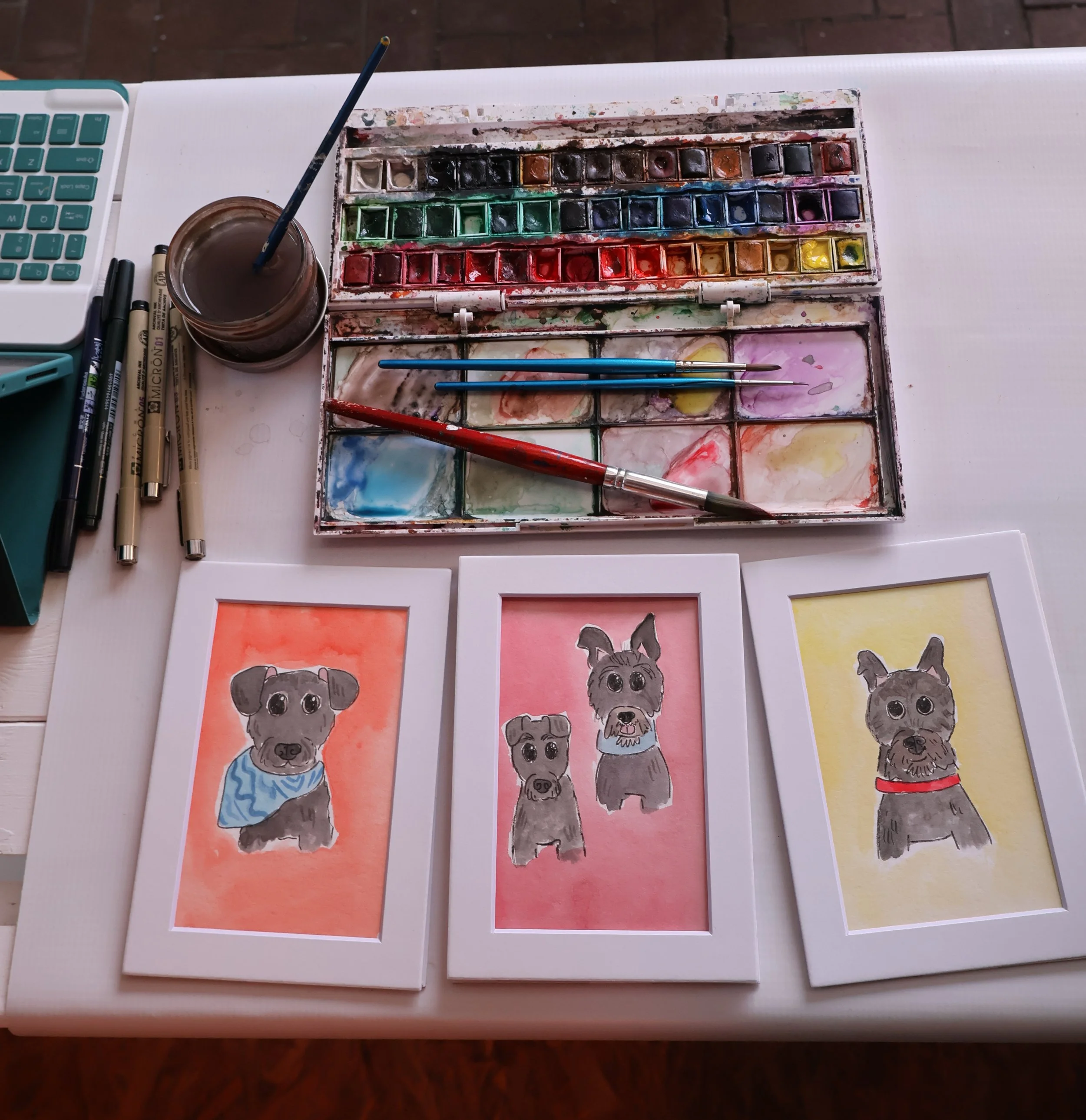 The live painting set up with three dog portraits, finished, and ready to go to their new homes.