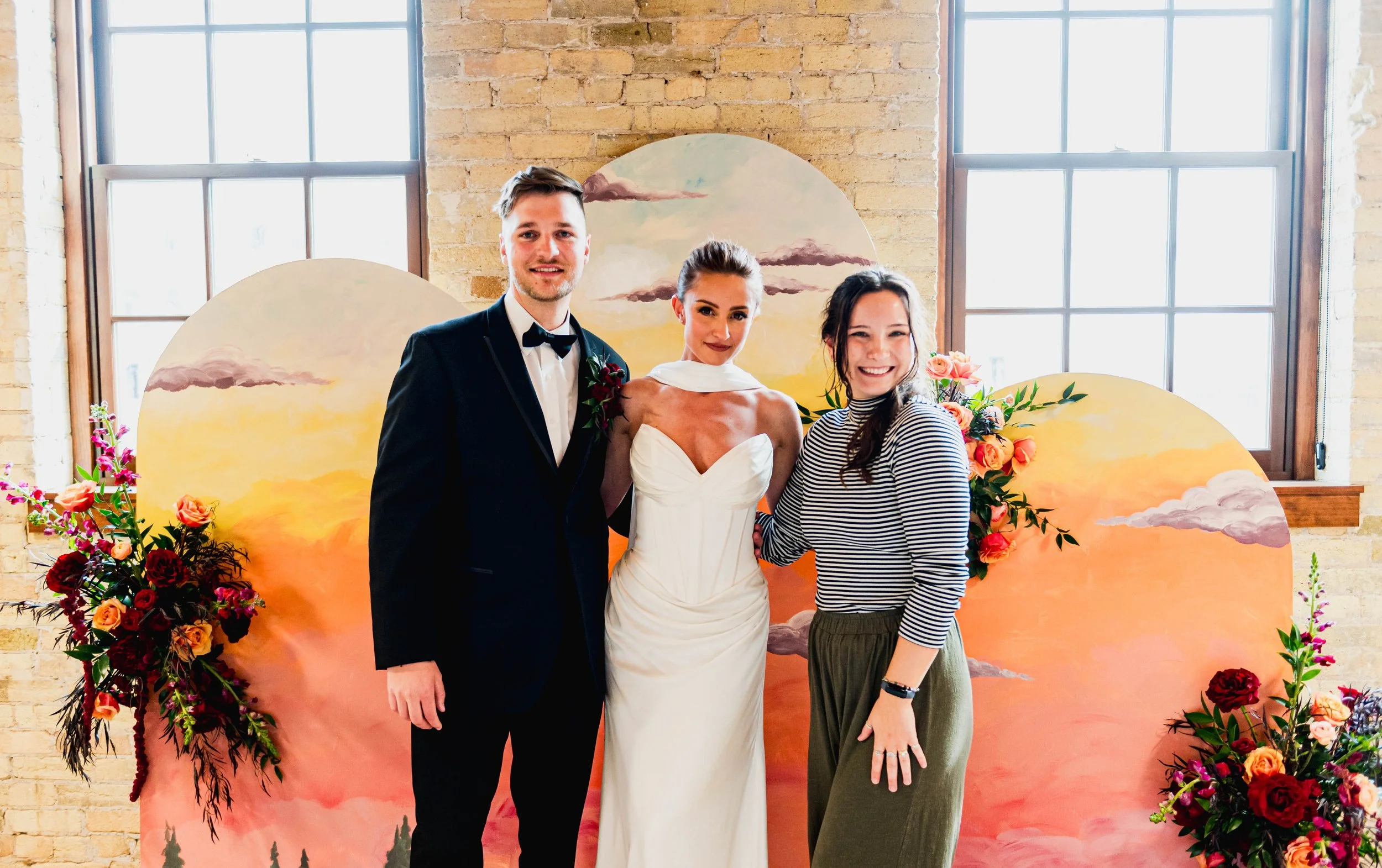 Cayla with a Bride and Groom in front of her painted ceremony panels.