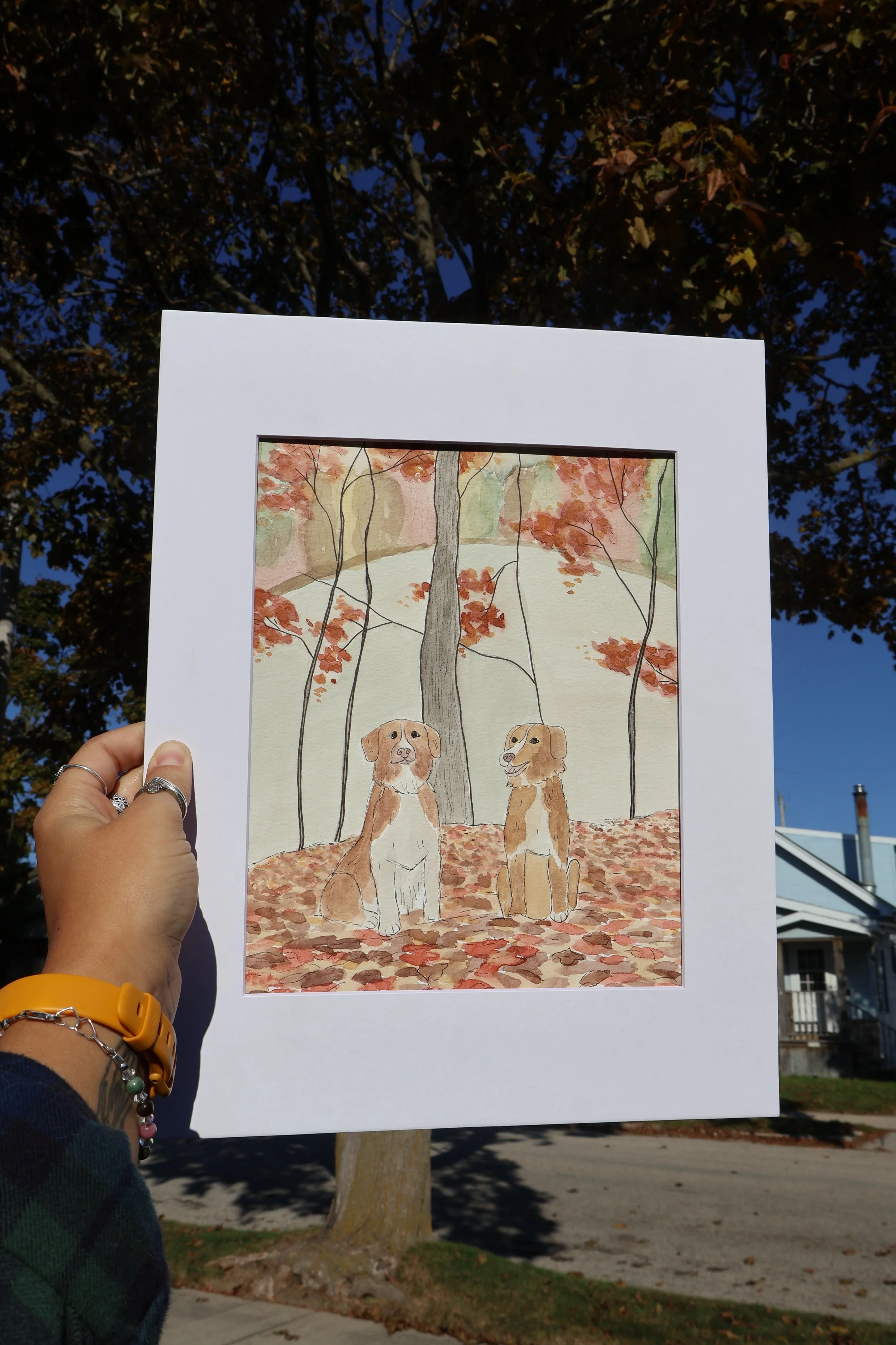 Fall painting of two dogs, surrounded by leaves.