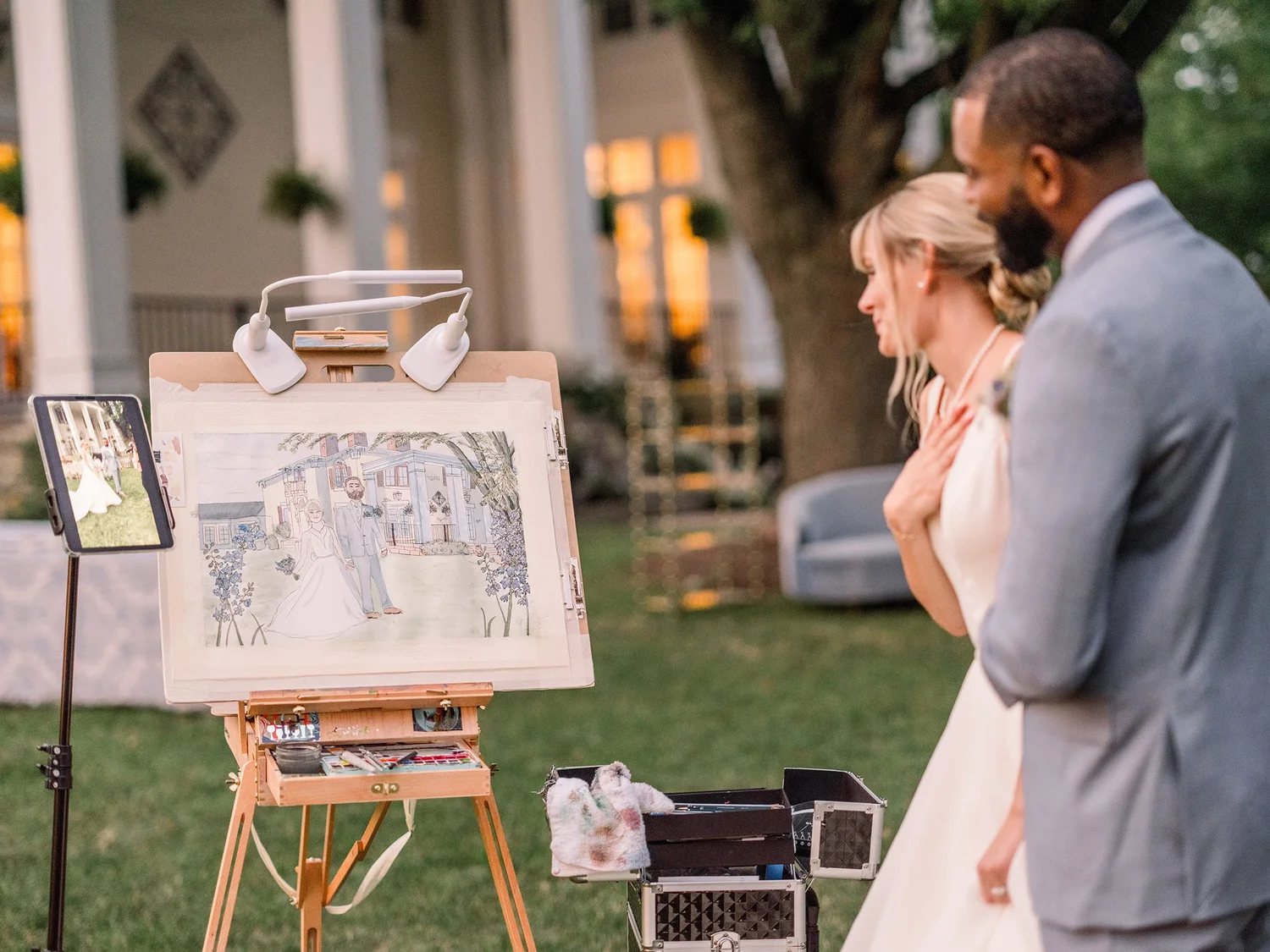 A bride and groom admiring their live wedding panting during the reception.